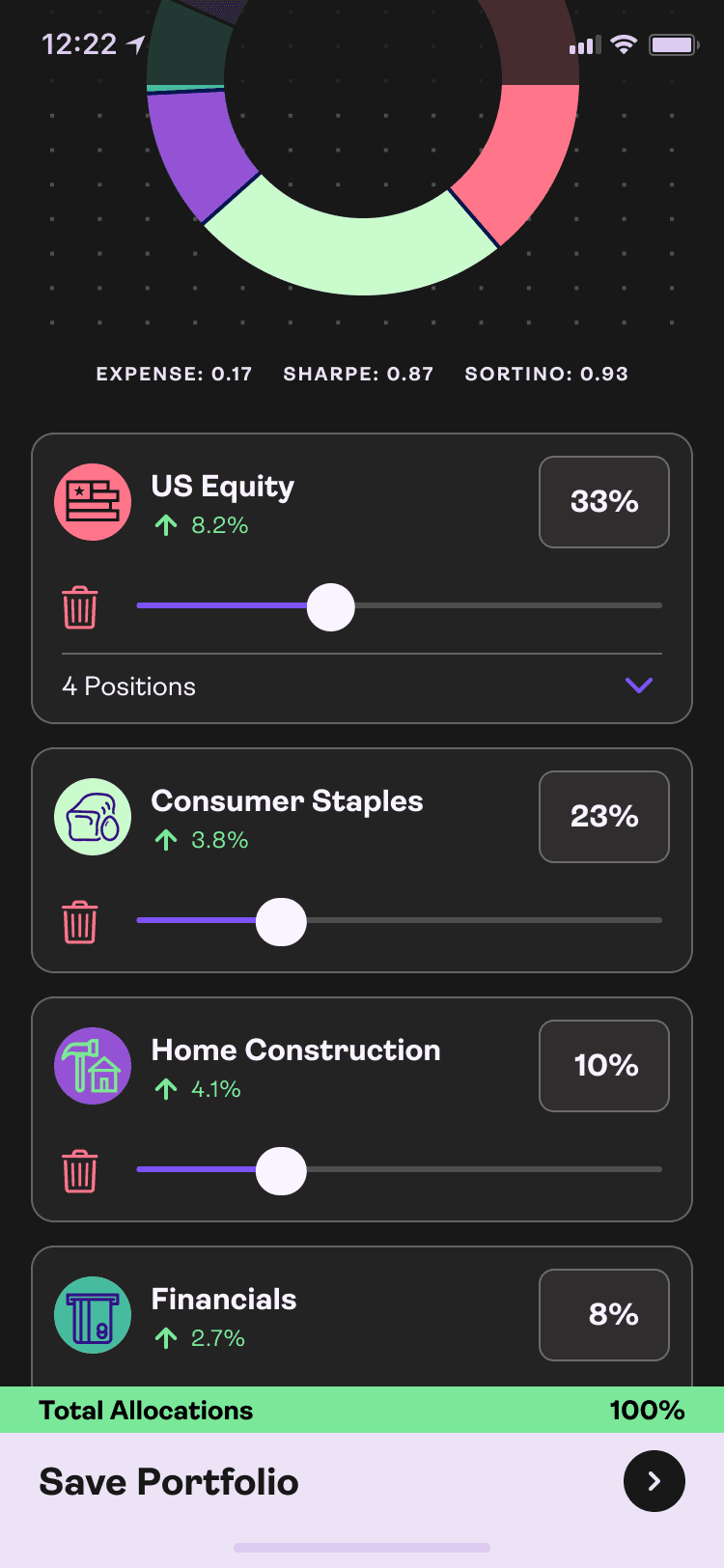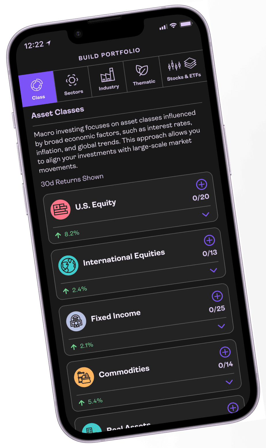 Select your mix of asset class exposures, then allocate by sector, industry, or theme.